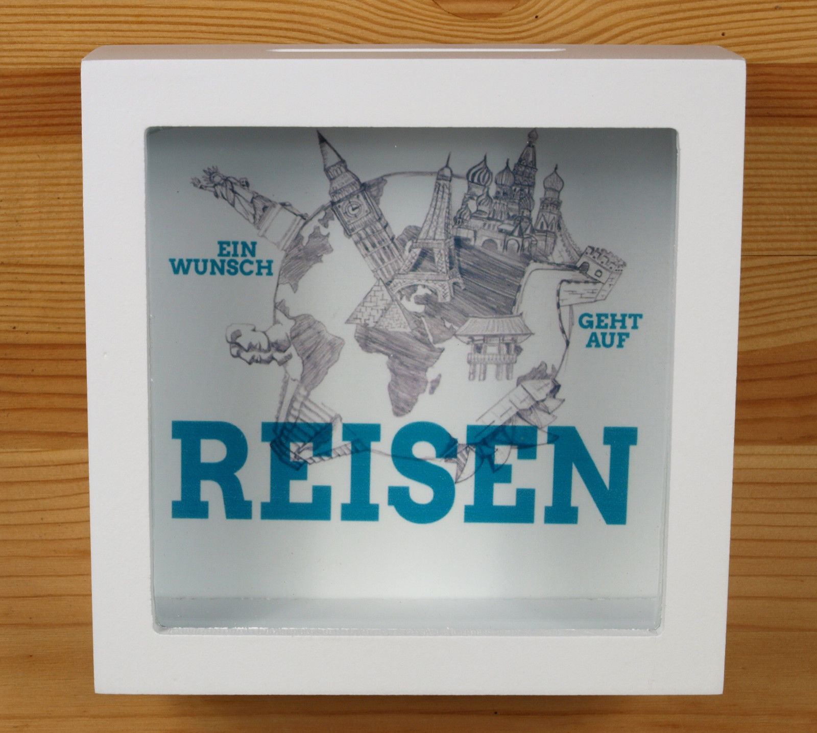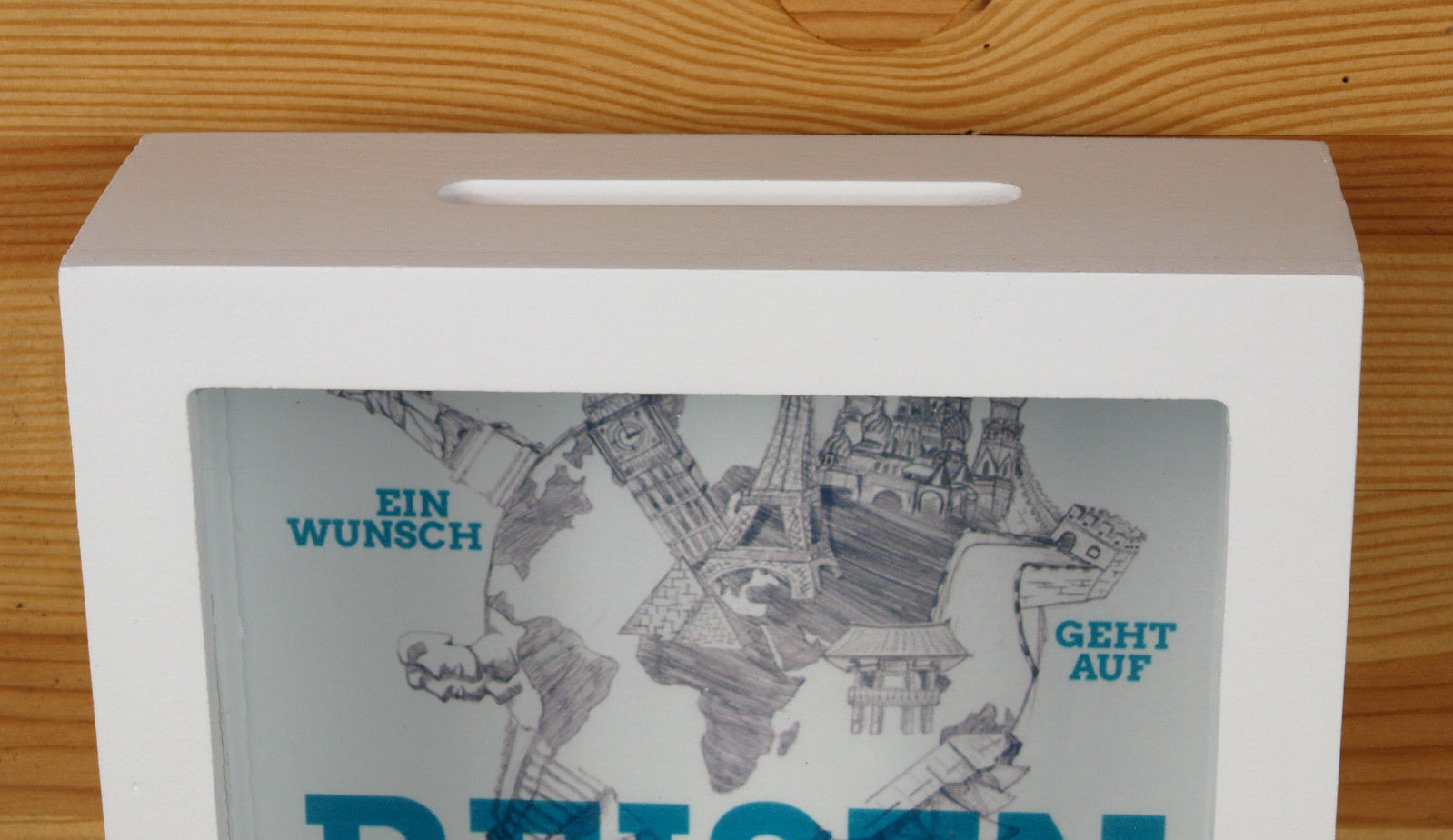 Spardose Sparbüchse Urlaubskasse Reisekasse in weiß aus Holz ca. 15x15x5cm