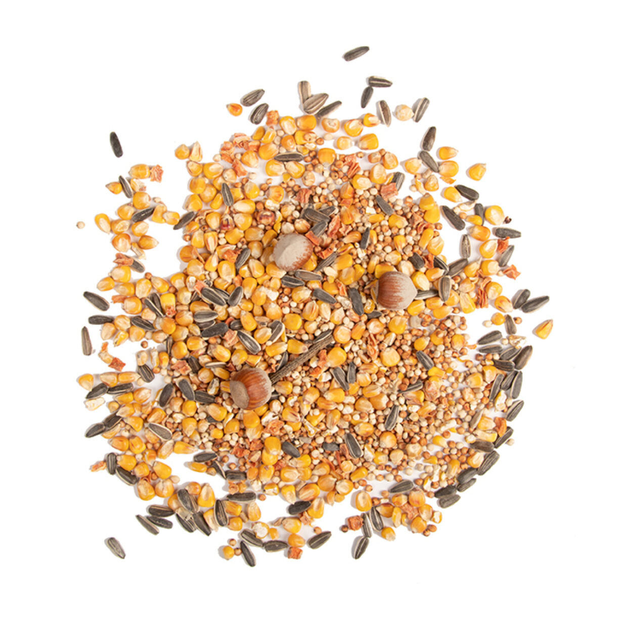 Zusammensetzung: Mais, Sorghumhirsensamen, Hirse, Haselnüsse, gestreifte Sonnenblumenkerne, Karottenflocken