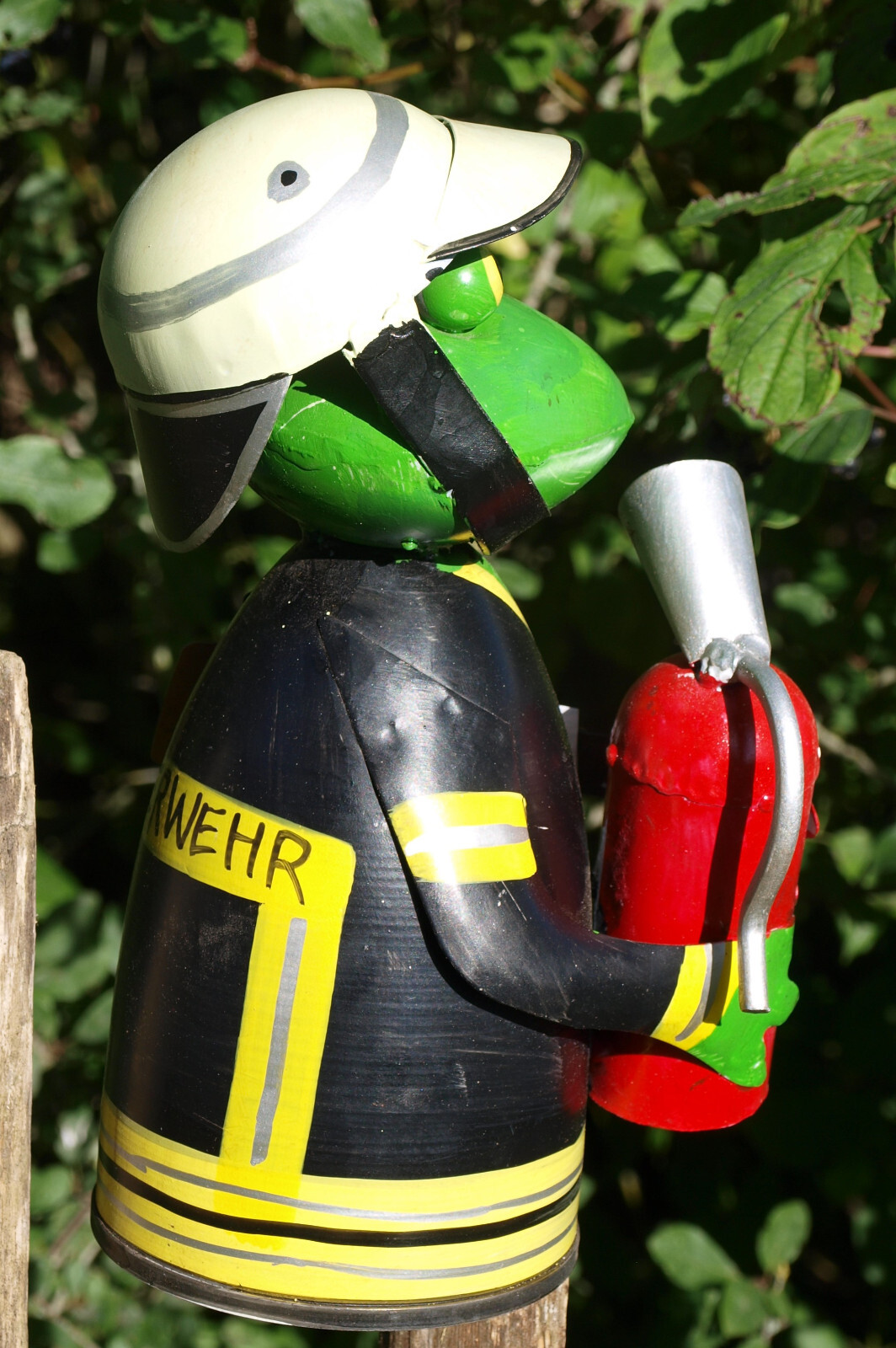 Deko Frosch als Feuerwehrmann und mit Feuerlöscher aus Metall. Zur Deko als Zaunhocker oder z.B. als Dekofigur fürs Blumenbeet. Die Figuren werden in Handarbeit hergestellt und bemalt, deshalb sind kleinere Abweichungen in Form und Farbe möglich.