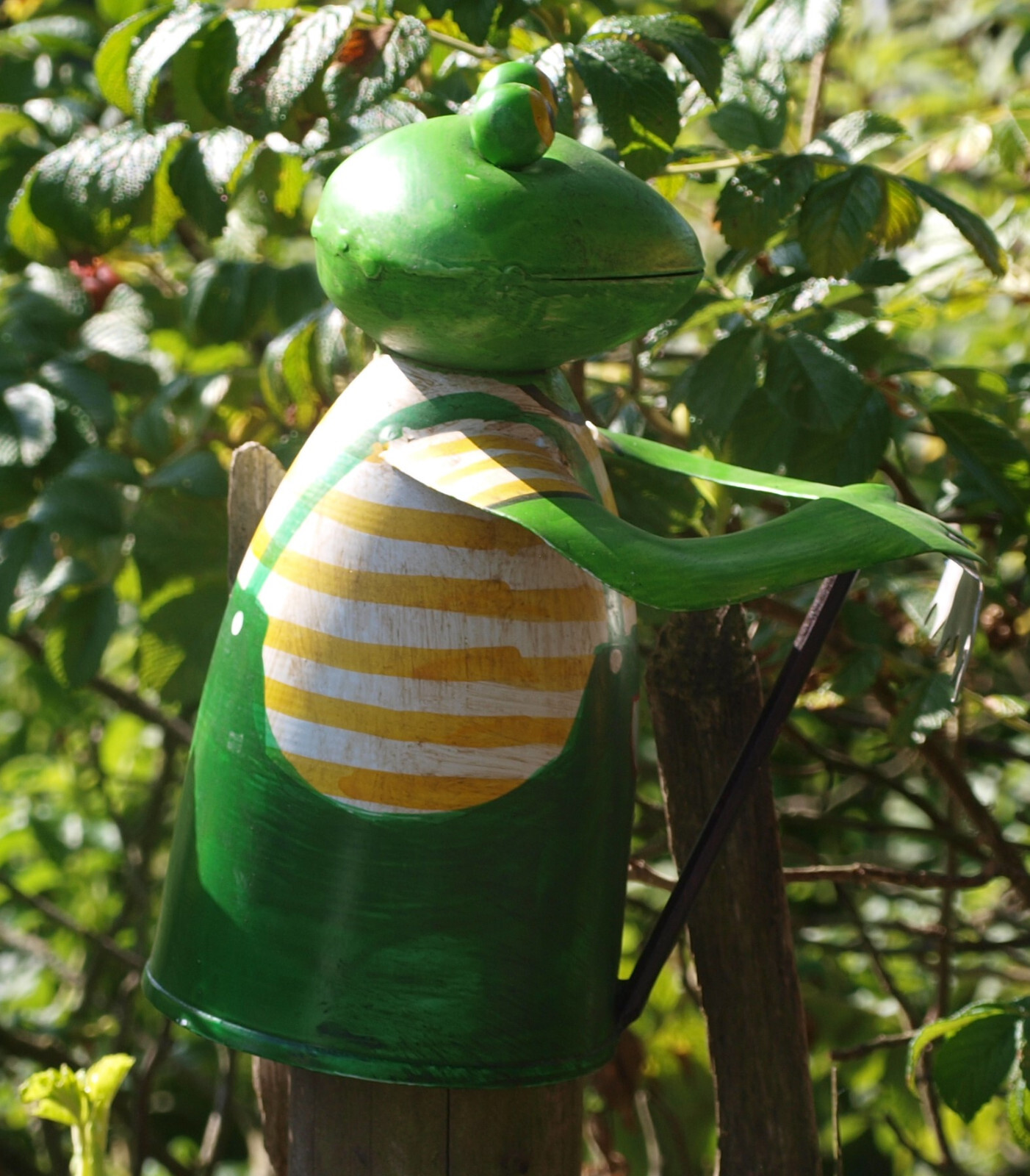 Deko Frosch Gärtner aus Metall als Zaunhocker. Die Figuren werden in Handarbeit hergestellt und bemalt, deshalb sind kleinere Abweichungen in Form und Farbe möglich.